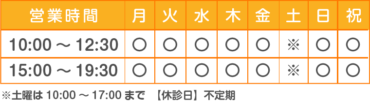 また、皆様にいつでもお気軽にご来院頂けるように平日・土曜日・祝日は夜20時まで、日曜日も18時まで営業しています。